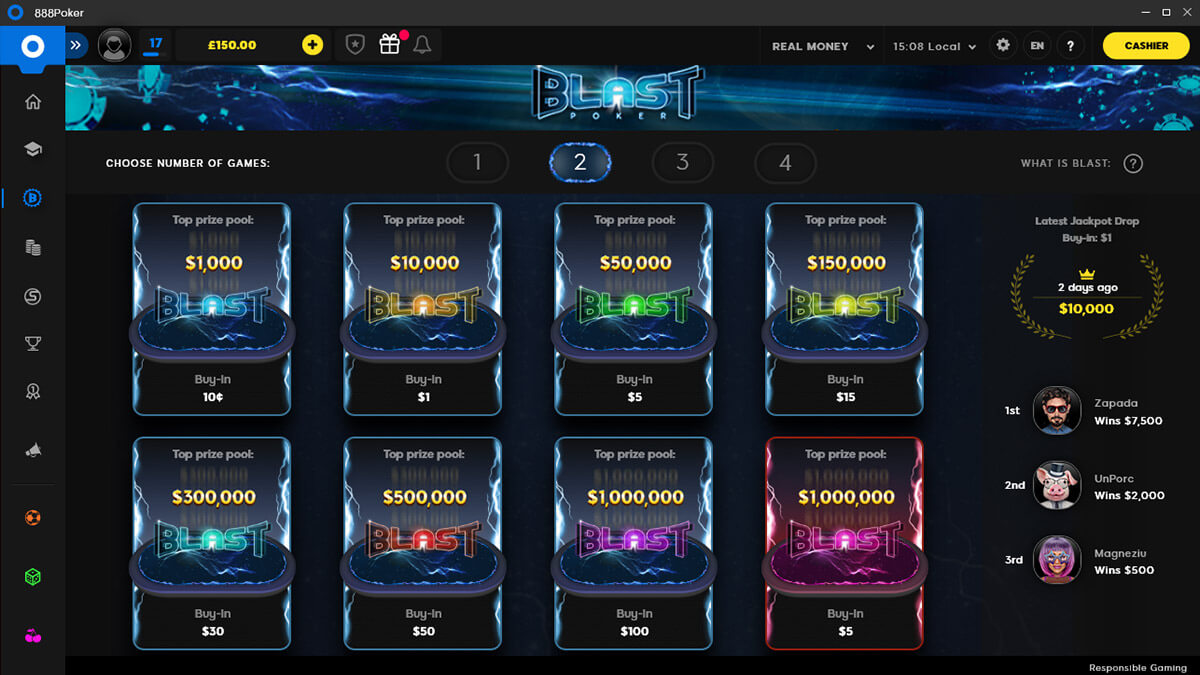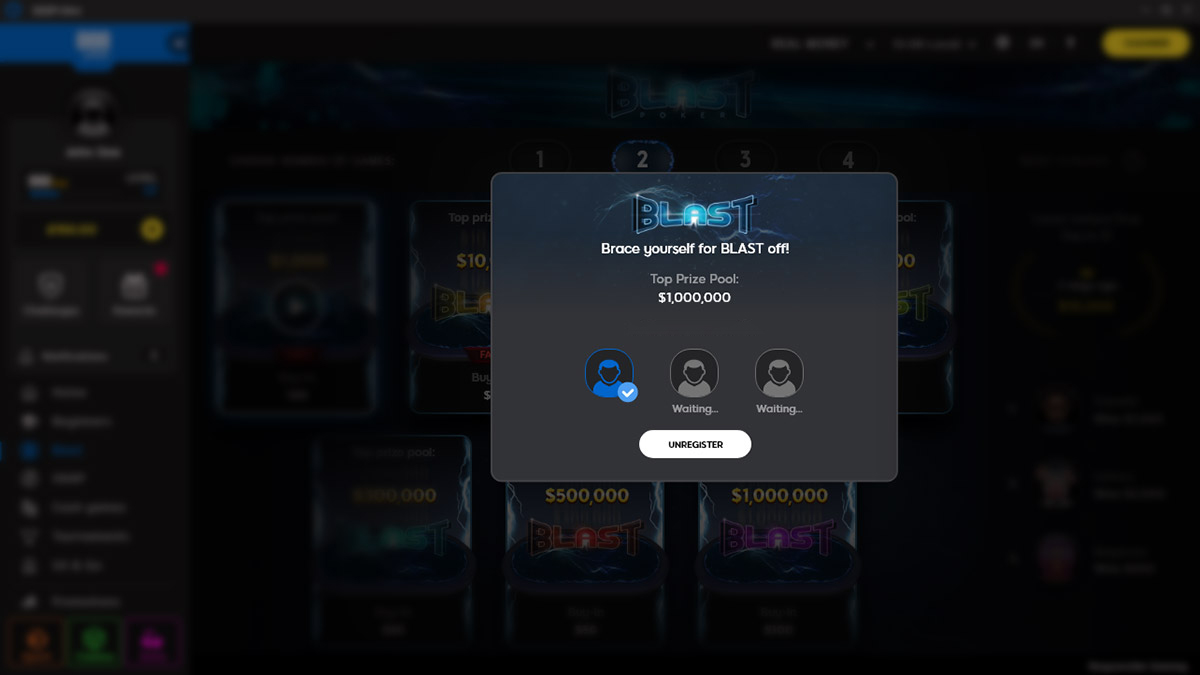 BLAST — это Super-turbo Texas Hold’em Sit & Go на 3 участников. Чтобы добавить элемент интриги, призовой фонд каждого BLAST Sit & Go остается неизвестным вплоть до начала турнира. Его размер определяется случайным образом в начале каждого турнира BLAST. Мультипликатор бай-ина варьируется от 2 до 10.000.
