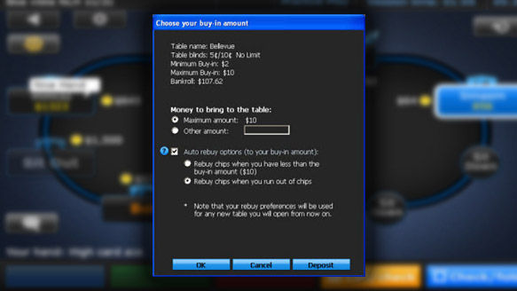 Поставьте флажок «Автоматически докупать фишки», чтобы в случае проигрыша всего стека вы могли докупить фишки и продолжить игру, не выходя из-за своего стола. Для этого укажите сумму не меньше минимального бай-ина для этого стола, которая будет вам автоматически доставлена из вашего банкролла, и затем щелкните «OK».