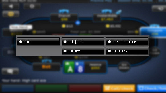 с цветной полосой («Колл», «Фолд», «Чек», «Ставка», «Увеличить до» и т. д.) будут появляться на игровом экране всякий раз, когда наступит ваша очередь хода. В безлимитных и пот-лимитных играх вы можете выбирать размер вашей ставки с помощью специального ползунка или текстового поля, расположенного рядом с этим ползунком.